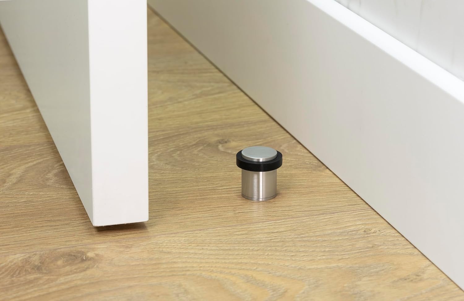 Door stop made of stainless steel. Mounting stop on the ground, screwing the base to the ground and then threading the stop body to the base. Natural silicone rubber in black. Measurements: 24 mm diameter, 33 mm diameter including rubber and 35 mm high.