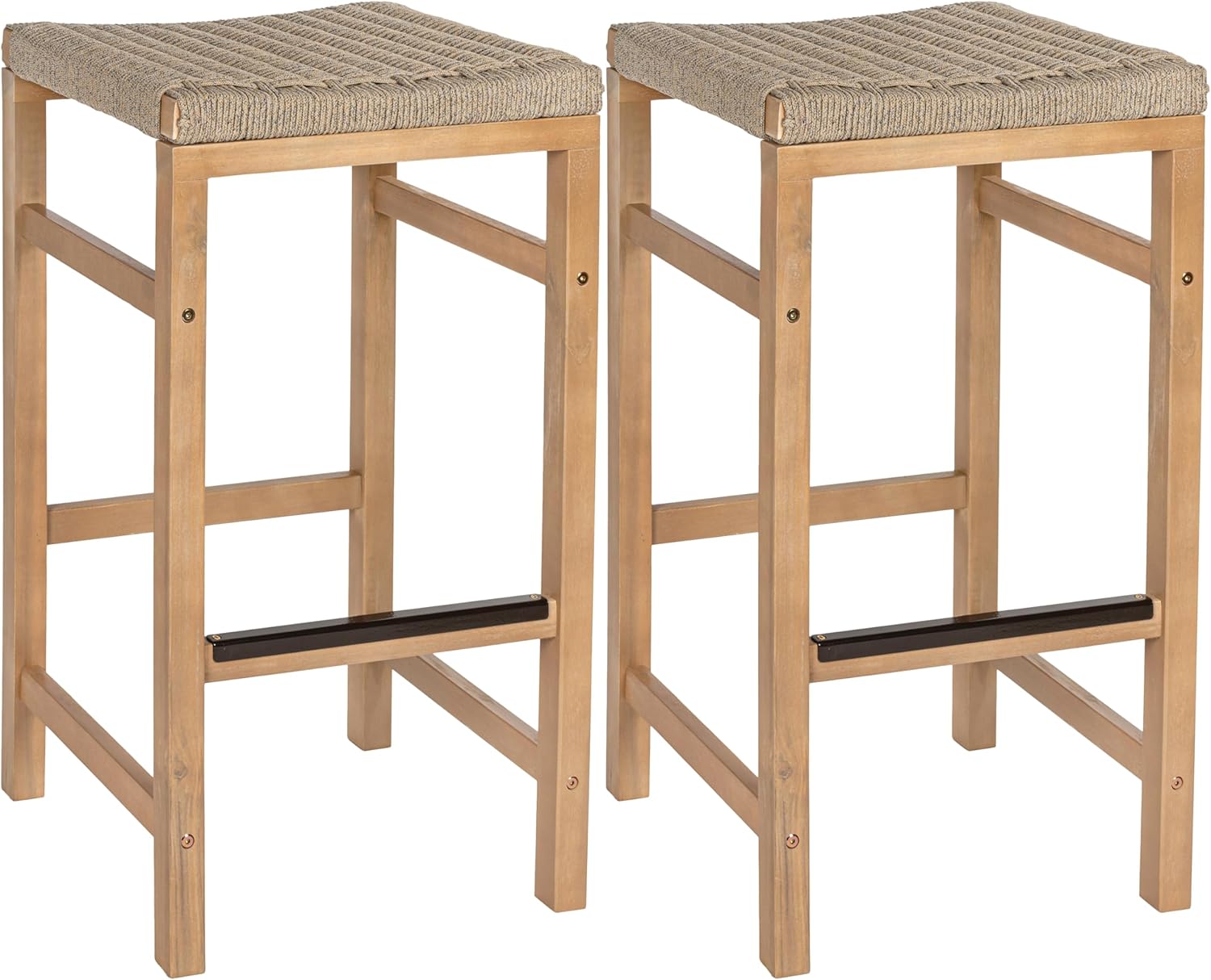 An inspired mix of rustic and modern styles, this pair of counter stools adds a coastal touch to any space. The unique design combines the textures of rope webbing and natural wood grain on a sturdy acacia wood frame. Perfect for outdoors or in, the backless design fits easily with a 25.6" kitchen countertop.